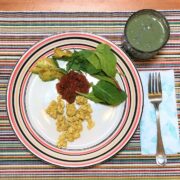 Jessica promises that the food she is making is going to be easy for anyone to make, and she appears to make these recipes very effortlessly. Jessica adds a little curry powder to give the tofu eggs scramble a nice yellow color. She also makes the protein smoothie with spinach, frozen fruit, flax milk and protein powder. Easy as can be you have a tofu scramble and a protein smoothie to get your day off to a great start!
