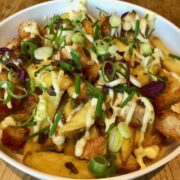“Loaded fries” topped with crunchy truffle chick’n and a “hollandaise” sauce.