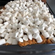 Transfer the sweet potato mixture to a 9 x 9 inch baking dish and smooth out the top with a spoon. Sprinkle with the remaining 1/2 cup of pecans, then top with marshmallows.