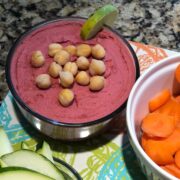 First, Tracy shows us how she makes the baked tortilla chips for the hummus. She uses precooked beets from Trader Joes grocery store. To fulfill the tahini flavor, Tracy puts sesame seeds in the blender first. You can soak your garbanzo beans before cooking them, or use Nicky’s tip and add about a tablespoon of apple cider vinegar when you’re cooking the beans. Once you get all of your ingredients in your high-powered blender, you can blend them until smooth. The hummus turns a beautiful deep pink color thanks to the beets. Eat it with your Ezekiel chips or veggies. Tracy and Nicky say that it is delicious with a hint of sweetness from the beets. Make this colorful hummus at home with the recipe below!