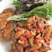 Gwenna’s recipe is super simple. She cooks the pasta that she bought from Brandless.com. Brandless is an amazing website to stock your pantry with vegan items and all the items are only $3 or less! Gwenna sautés the mushrooms and the rest of the vegetable ingredients. Then she heats up the marinara sauce. Gwenna adds optional Beyond Meat pea protein beef crumbles, which is especially helpful to those who like the texture of meat. This recipe is just as good without the crumbles if you prefer not to eat any processed foods.