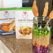 When ready to serve, grill the Fry’s Prawns. Skewer the prawns and place them in the salad jar.