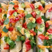 Recipe: (makes 8 Taquitos)Turn oven to 375 degrees. Line a baking sheet with parchment paper.Put black beans and corn in food processor and blend.Put mixture into bowl and add bell peppers, onion, vegan cheese and fresh minced garlic. Stir togetherPut finished mixture inside each flour tortilla and roll them up, putting seam down.Lightly brush olive oil on the top to make taquitos crispyBake 20-25 minutes, turning onceTake out and let cool.Place taquitos on a serving platter and top with chopped fresh cilantro, avocados, chopped tomatoes, green onions, squeezed lime and chipotle sauce.