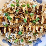 Place cooked skewers on a bed of brown rice and drizzle peanut sauce, top with finely chopped green onions and sesame seeds (I used white and black seeds) You can also take the vegan chicken off of skewers and build up a bowl on top of the brown rice, using all toppings listed above. ENJOY!