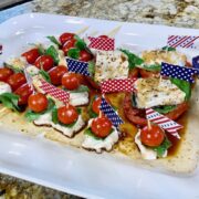 Today #Live on #SaturdaySnackdown, Erin Riley-Carrasco, PETA (People for the Ethical Treatment of Animals)’s Sexiest Vegan Over 50, is making whimsical and delicious Mini Caprese Bites, Skewers and the more traditional presentation of beefsteak tomatoes slices with the vegan mozzarella slices, fresh organic basil & Balsamic Reduction. These delicious hors d’oeuvres are perfect for backyard summer parties and today, Erin went with a fun, 4th of July theme for the upcoming holiday. Being vegan has never tasted or looked so good! Enjoy!