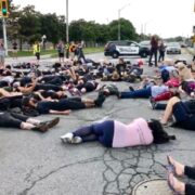 Activists stage ‘die-in’ outside slaughterhouse where 50,000 pigs are killed every week.