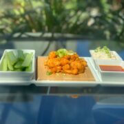 Jane Elizabeth posing with her delicious Cauliflower wings!