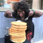 Gwenna is ready to dig into this beyond an all-you-can-eat giant stack of pancakes!