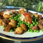 Pass The Peas Please: Pea and Plant-based Crab Cake Salad with Roasted Multi-colored Nibble Potatoes