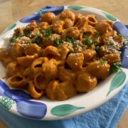 - When the large pot of water is boiling add the pasta shells and a pinch of salt to the pot. Boil according to package instructions, but a bit longer than al dente, and then drain.