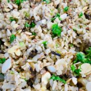 Wild Rice Pilaf and Mushrooms, two of Erin Riley-Carrasco’s favorite foods. This super easy recipe is so delicious and packed with 12 grams of protein per serving. It is a total misconception that you need animal flesh as your main protein source. People do not realize that there is PLENTY of protein in vegetables, grains, nuts, and seeds. PLENTY! This recipe also has no oil, so for those of you adhering to a WFPB diet, this recipe is a must-try. This dish can be doubled in ingredients and put in a large casserole dish to take to friends or family gatherings (serves 10). Or simply make it as a quick and easy meal for your family. It’s a perfect recipe for holidays, or for a weeknight family meal.