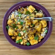 - -Whisk all ingredients together and then add the crispy tofu cubes back into the pan with the sauce and cook over medium heat, stirring often so the tofu and peanuts soak up the sauce. Cook for 5-10 minutes.