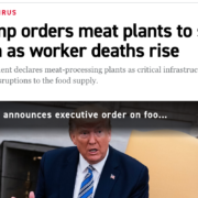 President Donald Trump has sparked widespread outrage with his demand that slaughterhouses remain open, even if that means workers might die from coronavirus as a result. The president declared that the slaughtering of animals for beef, chicken and pork is a “critical infrastructure.” To that, one slaughterhouse worker responded, “Trump says we’re part of critical infrastructure, that we’re essential workers. I don’t feel critical. I don’t feel essential. I feel sacrificed.”