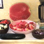 This soup has watermelons, cucumbers, bell peppers, onions, and jalapenos in it. Does that not sound amazing, or what? It’s a super intriguing soup, incredibly refreshing, and full of so much health and nutrients. It couldn’t be easier to make so I hope you give it a try. The recipe is below.