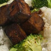 - Preheat oven to 350 degrees. add 1 cup of rice to 2 cups of water and boil. Use directions on rice for how long to cook. Place tofu in tofu press. Place broccoli in small pieces on cooking sheet. optional drizzle with olive oil and add salt to taste. Add pepper to taste. Bake broccoli for 15 minutes. mix tamari or soy, lemon, maple syrup, sriracha or viracha, and garlic powder together in bowl. squeeze out remaining water in tofu and cut into 24 small pieces and add to sauce, mix to make sure to cover all of the tofu in sauce. Add either coconut oil or water to pan and get hot. Add tofu but leave remaining sauce in bowl. let cook for 3 minutes or until brown then add rest of sauce and flip until other side is brown. Serve with tofu on rice and broccoli on the side and enjoy!
