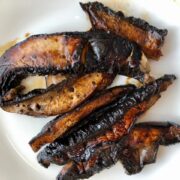 - Mix together in a medium bowl the soy sauce, mirin, vinegar, syrup, water, and toasted sesame oil. Remove the stem from the mushroom and scrape out the gills. Cut the mushroom into slices about ¼-inch wide. Place the mushroom slices in the bowl and toss to coat in marinade. Let sit for up to 30 minutes or use immediately. Heat a pan over medium heat. Arrange the mushroom slices in a single layer and pour over any remaining marinade. Cook for several minutes on each side until the slices are browned and softened.