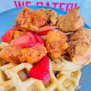 Strawberry Waffles topped with Hot Sauce and Pepper Caulifyah Wings