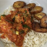 - Long grain parboiled white rice and fried plantains for serving