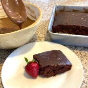 Also known as depression cake, the batter for this quirky old-school chocolate cake is stirred together right in the baking pan (no mixing bowl required!), which is how it earned its name. The cake recipe also contains no eggs or milk, which is why it was a popular treat during lean times. Wacky Cake is delicious eaten on its own, especially with a cold glass of plant milk, but we added a layer of fudgy frosting and chopped toasted pecans to make it more decadent. Some testers said it reminded them of a Texas Sheet Cake, but it’s much easier to pull off. Make sure to sift the dry ingredients right into the baking pan, don’t just combine everything in the pan and stir it up. Sifting makes the cake light and tender. If you don’t have a sifter, don’t worry—you can use a fine-mesh strainer instead.